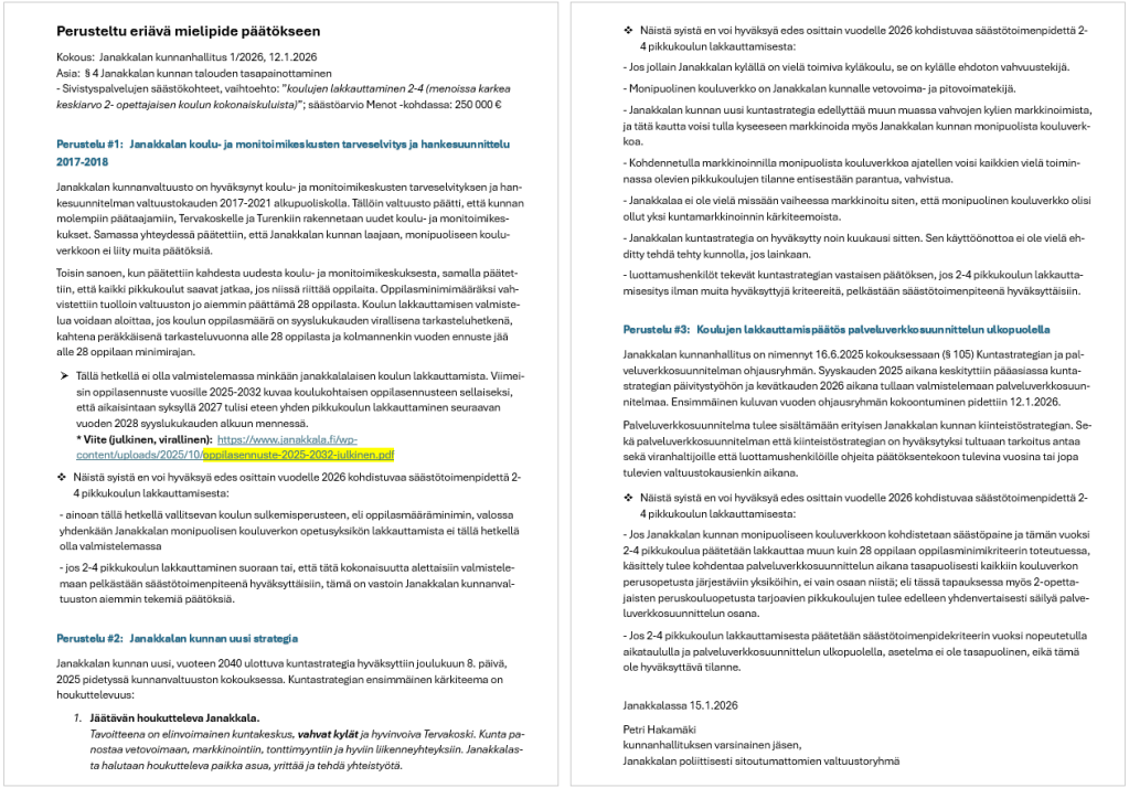Perusteltu eriävä mielipide 15.1.2026 – Petri Hakamäki; Asia Jankh 1/2026 12.1.2026 §4.