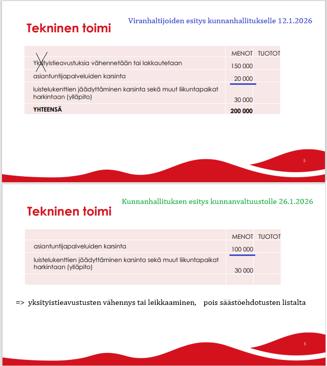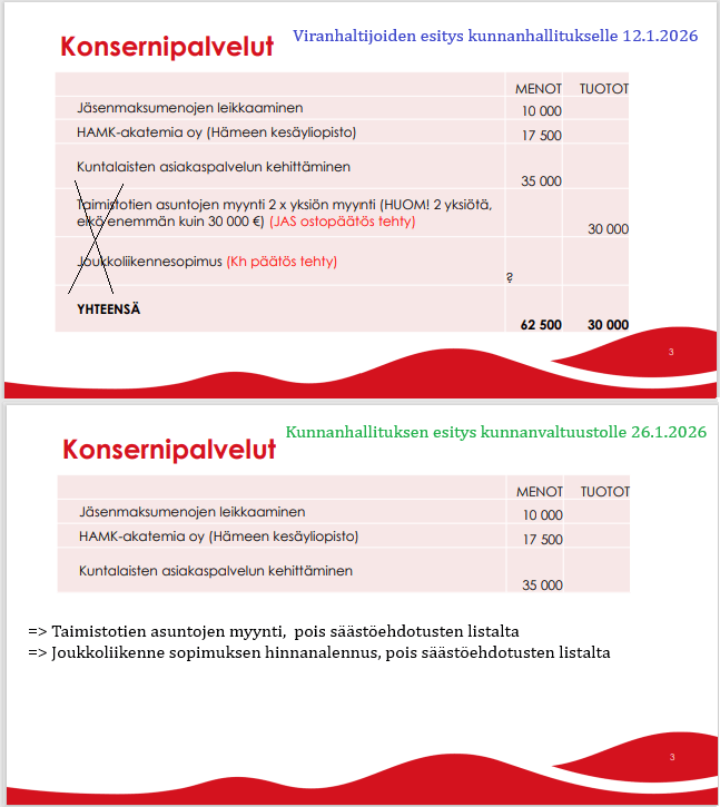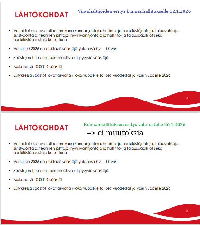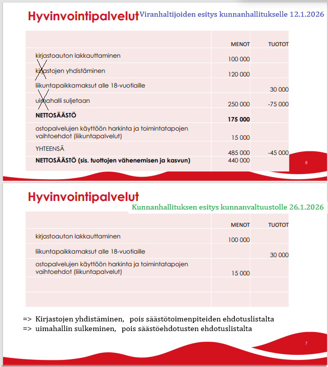 Tässäpä teille nopea läpikäynti viranhaltijoiden säästötoimenpide-esityksestä 12.1.2026 kunnanhallituksen kokoukseen sekä siitä, miten niitä jäi valtuuston 26.1. kokoukseen esityksiksi.